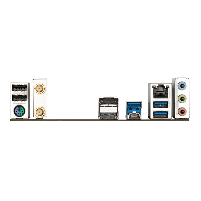 Conexiones traseras: 5x USB, 1x USB Type-C®, 1x PS/2, 1x DisplayPort, 1x HDMI, 1x RJ-45, 3x audio jacks